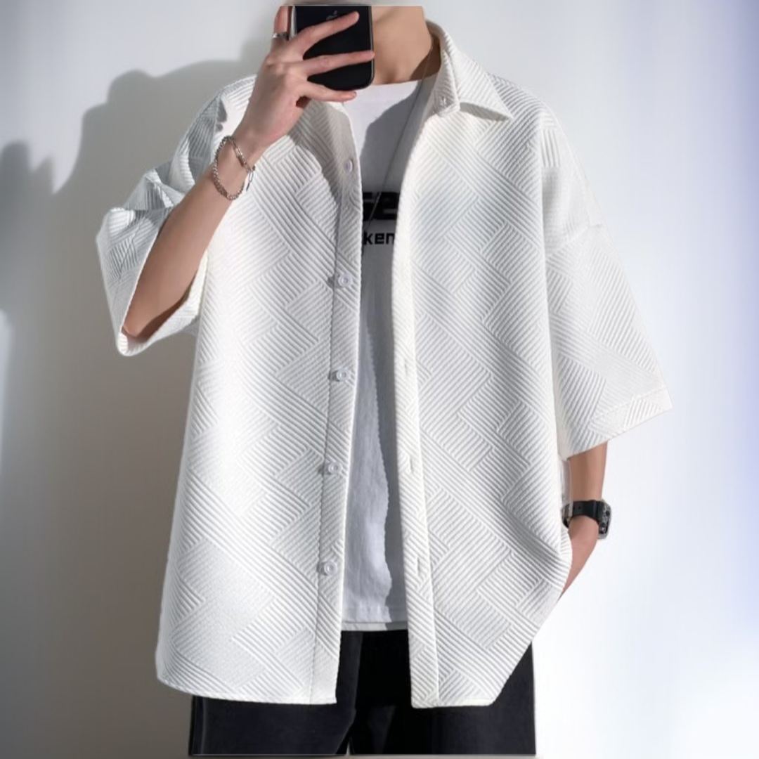 여름용 빅사이즈 남자 와플 셔츠, 얇고 통기성 우수, 루즈핏으로 편안함, 캐주얼 스타일 화이트 반팔 아우터, 다양한 코디 활용 가능.
